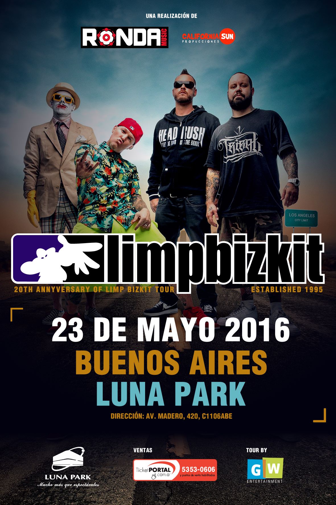 LIMP BIZKIT vuelve a la Argentina el día Lunes 23 de Mayo en el marco de su gira “20th anniversary of Limp Bizkit Tour”. La banda liderada por Fred Durst con más de 40 millones de discos en el mundo llega nuevamente a Buenos Aires para realizar un show especial festejando los 20 años de Limp Bizkit con todos los hits de su carrera tales como “My Generation”, “My Way”, “Nookie”, entre otros. Las entradas estarán a la venta a partir del martes 8 de marzo a las 20 hs por sistema Ticketportal.