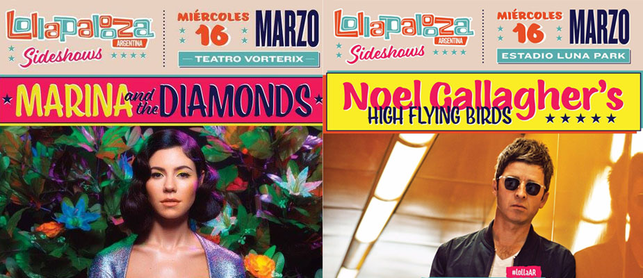 2 nuevos sideshows del Lollapalooza el 16 de marzo: Noel Gallagher en el Luna Park y Marina and the Diamonds en el Teatro Vorterix. Las entradas para Noel Gallagher están a la venta por Ticket Portal y las de Marina and the Diamonds por Ticketek.